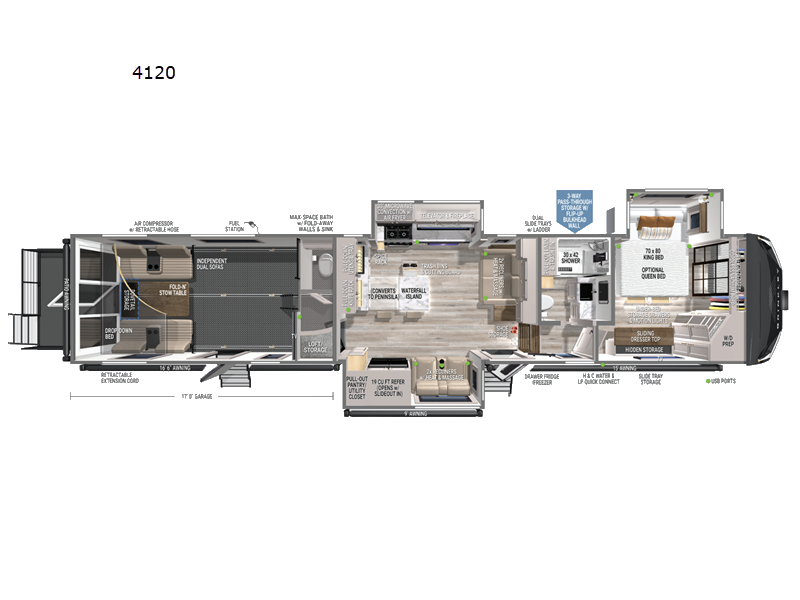 Sleeps 8 Slides 3 Length 46 ft 3 in Ext Width 8 ft 5 in Ext Height 13 ft 4 in Interior Color Sahara GVWR 23000 lbs Fresh Water Capacity 150 gals Grey Water Capacity 156 gals Black Water Capacity 85 gals Tire Size 215/75 R17.5 Furnace BTU 35000 btu Generator FlexPower 5500 Fuel Capacity 60 gals Number Of Bunks 1 Available Beds King Refrigerator Type GE Energy Star with Ice Maker and Filtered Water Refrigerator Size 19 cu ft Convection Cooking Yes Cooktop Burners 4 Shower Size 30" x 42" Number of Awnings 4 Axle Weight 7000 lbs Garage Size 17 ft LP Tank Capacity 30 lbs Water Heater Type Tankless AC BTU 40500 btu TV Info LR 50" Smart TV, Garage 43" Smart TV, BR 32" Smart TV Awning Info 9', 15', 16' 6", Rear Patio Power w/Neon Lights Axle Count 3 Washer/Dryer Available Yes Number of LP Tanks 2 Shower Type Standard Electrical Service 50 amp Solar Wattage 800 watts Similar Toy Hauler Fifth Wheel Floorplans