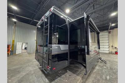 This unit is perfect for weekends at the campground or extended stays! There is ample seating with a sliding desk/dining table, 62" theater seating, and a 72" tri-fold sofa along the rear wall. You can easily relax and enjoy the telescoping TV with a cozy fireplace below. The kitchen offers all that you need to prepare and cook meals just like home with a 16-cu. ft. refrigerator for your perishables, a 30" residential microwave oven, and three burner range top and oven. You will love the kitchen island all outfitted with pull-out pet bowls and double pull-out trash bins with an integrated Stow & Go paper towel holder. There is also an 84" pantry with adjustable shelves for all of your canned and dry goods. Head up the steps to a find a full bath and a private bedroom with a king bed slide all the way up front. A sliding dresser top features hidden storage which is perfect for jewelry and other personal belongings. The front wardrobe features mirrored doors, and the corner closet has been prepped for a stackable washer and dryer if you choose to add that option.