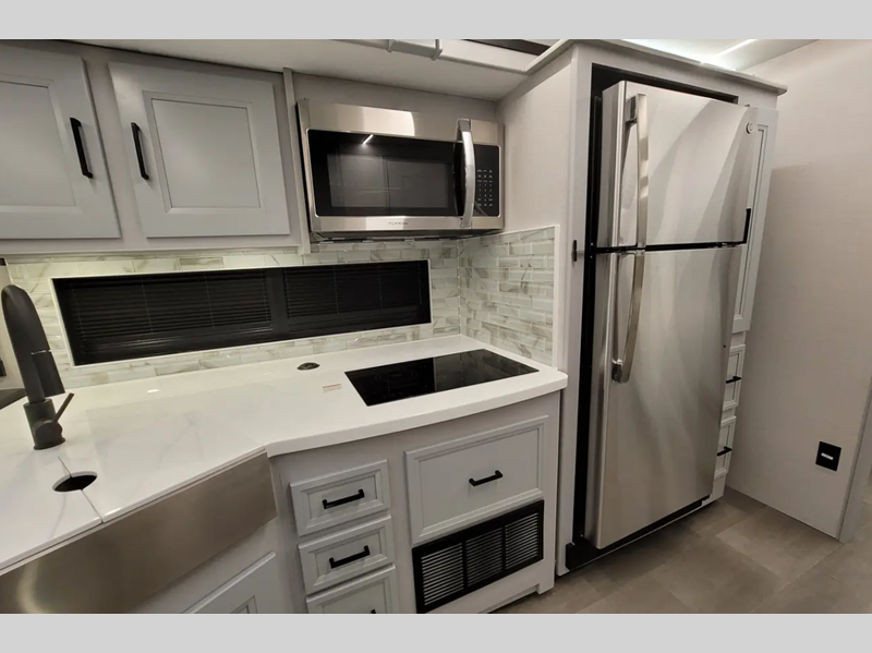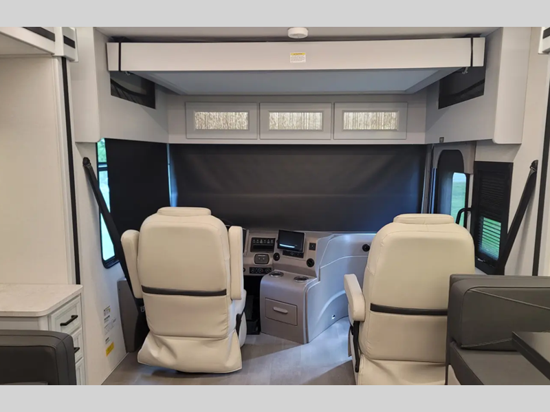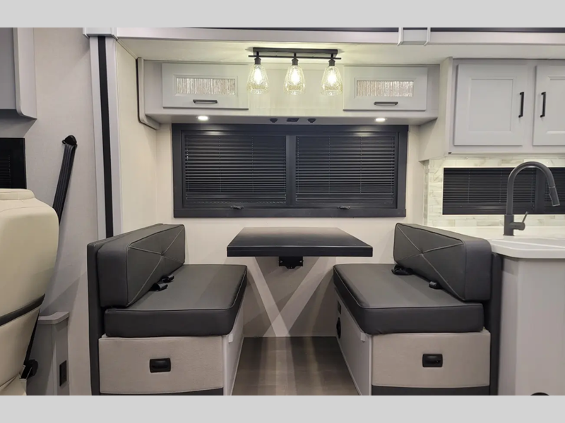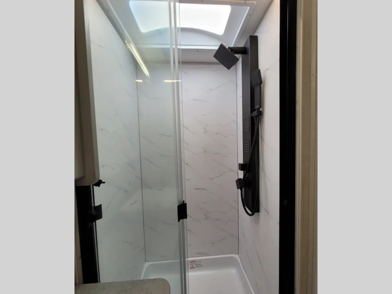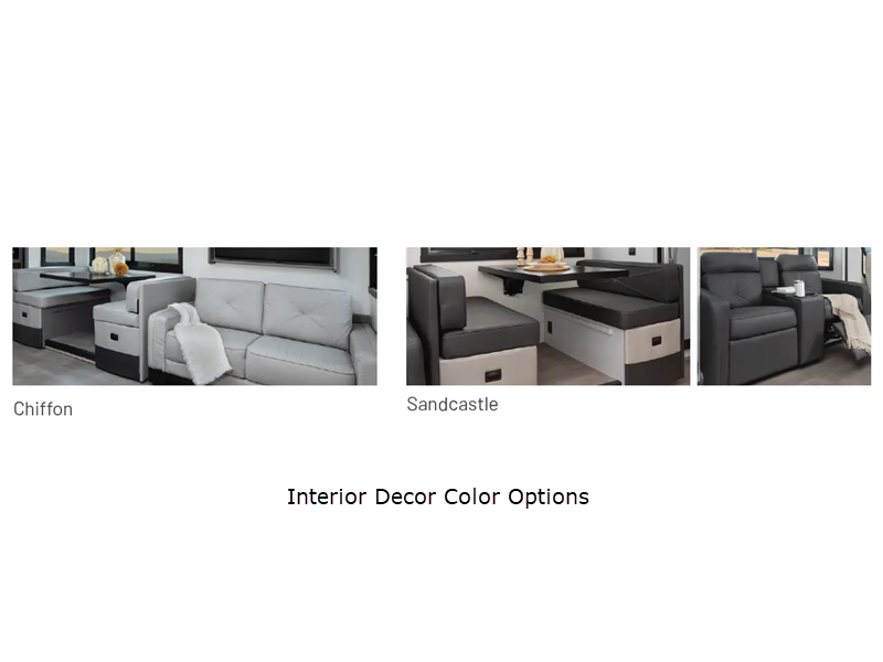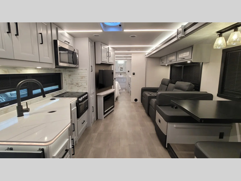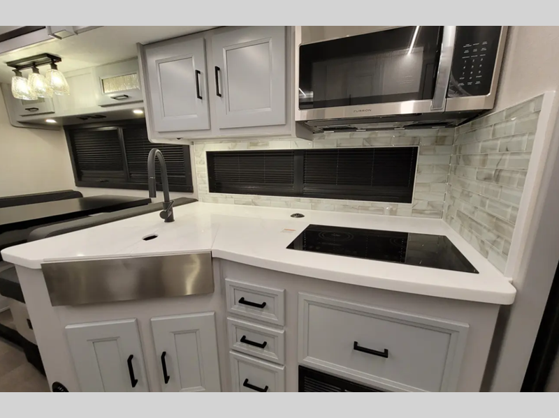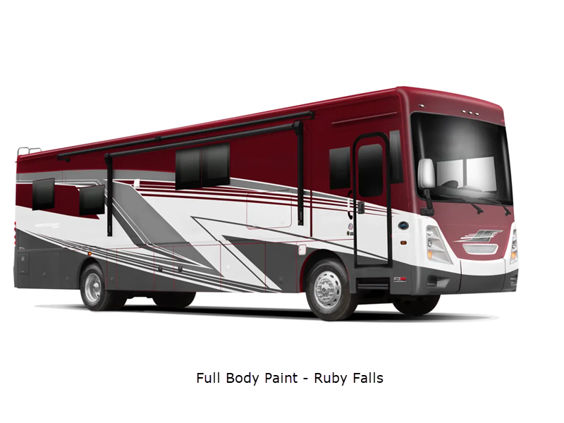 Each model is constructed with frameless tinted windows, front and rear fiberglass caps, and high gloss gelcoat sidewalls with Azdel superlite composite for durability. Inside, you'll find solid surface countertops in the galley, day/night shades throughout, an upgraded mattress, plus many more comforts. The whole coach water filter is sure to come in handy, as well as the fully automatic leveling jacks and the pass-through basement storage.
