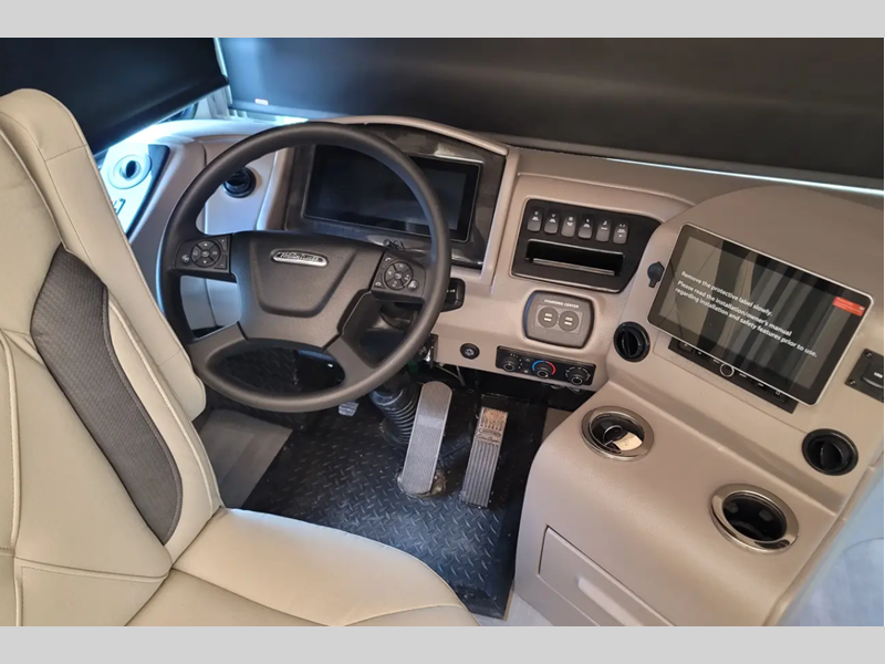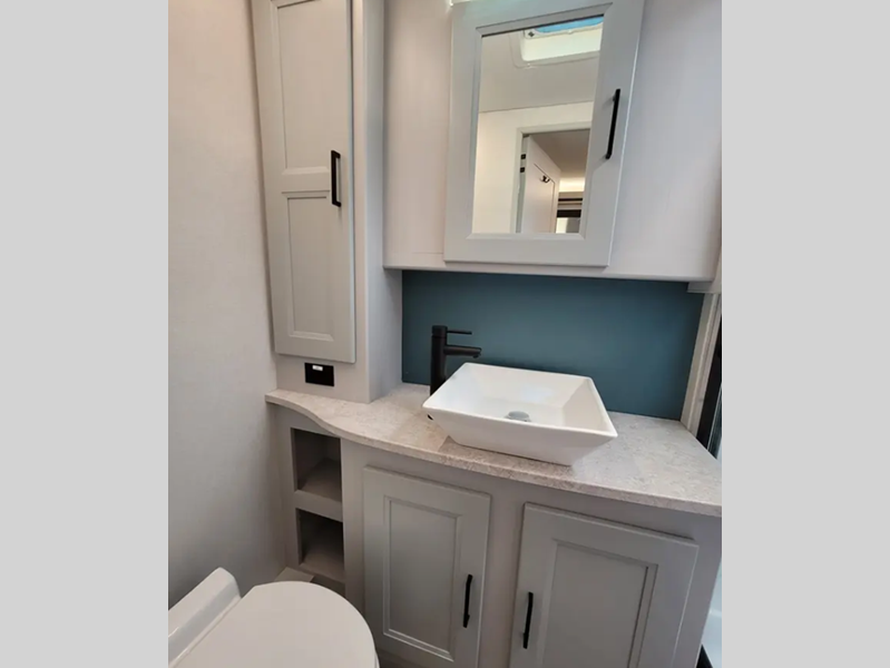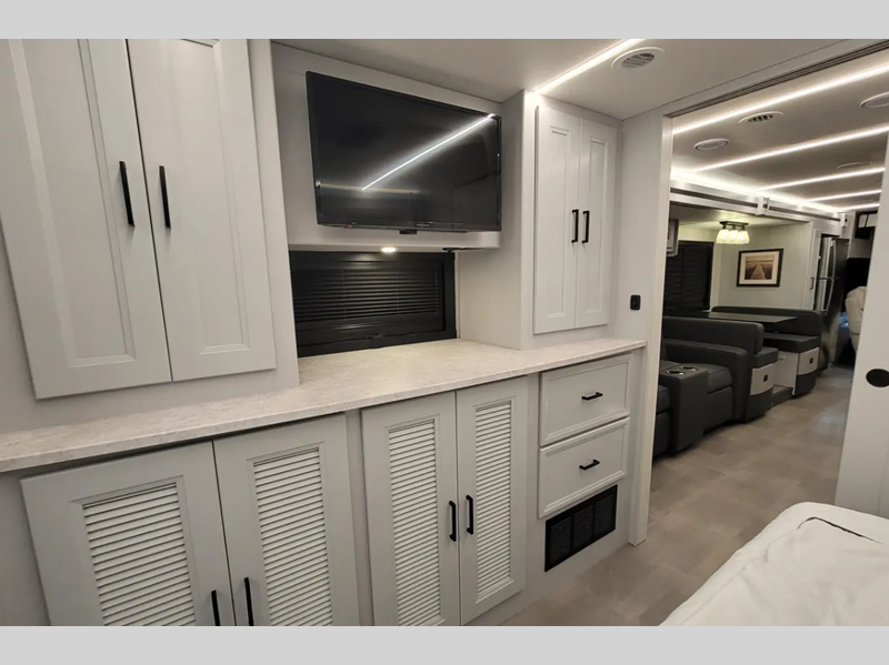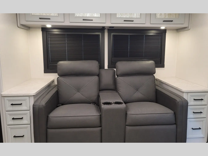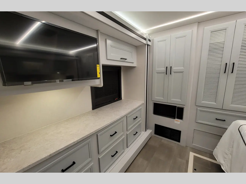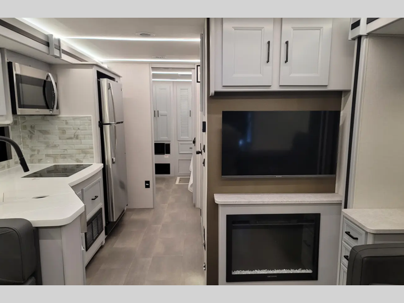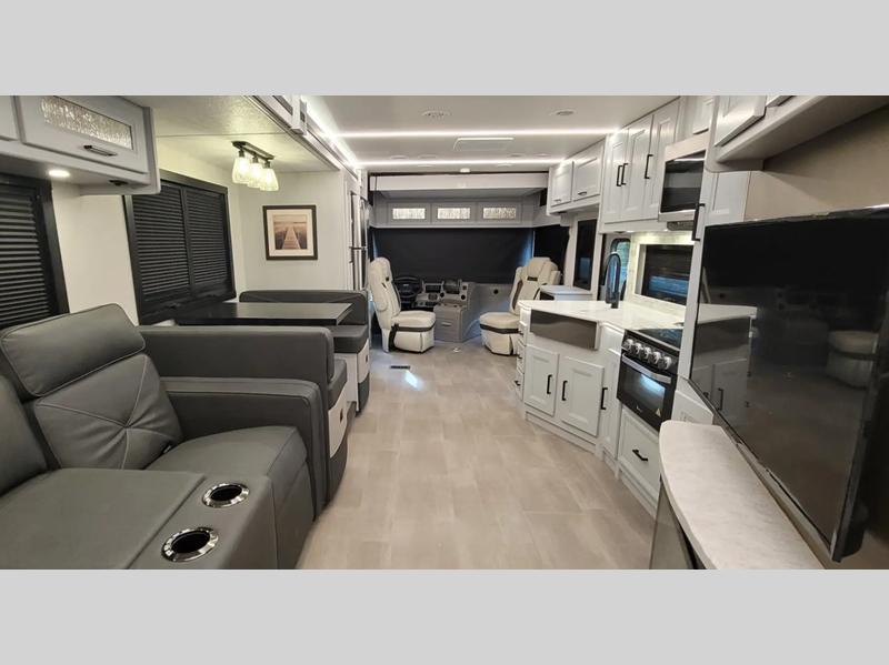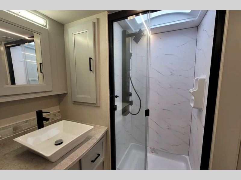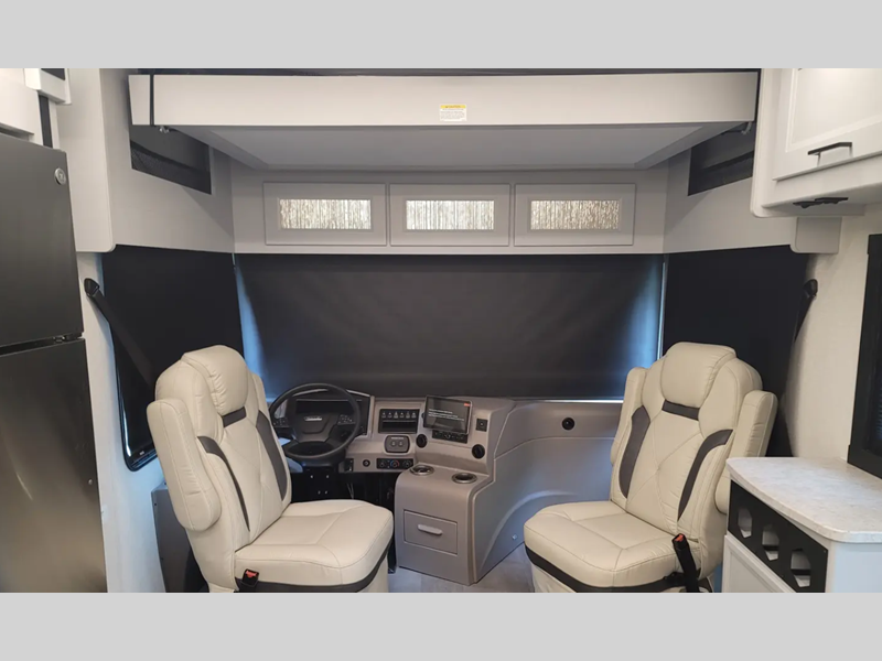 Each model is constructed with frameless tinted windows, front and rear fiberglass caps, and high gloss gelcoat sidewalls with Azdel superlite composite for durability. Inside, you'll find solid surface countertops in the galley, day/night shades throughout, an upgraded mattress, plus many more comforts. The whole coach water filter is sure to come in handy, as well as the fully automatic leveling jacks and the pass-through basement storage.