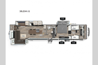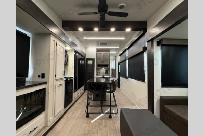 Some of the top features you'll find on these fifth wheels are an armored underbelly tank enclosure and forced air heat, an automatic leveling and stabilization system, and a Juice Pack solar system. Interior features continue on with solid surface countertops with underlighting, fully adjustable, slow rise, blackout roller shades in the main living area, and a pet friendly "Clean Sweep" floor design with no heat vents.