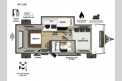Sleeps 4 Slides 1 Length 20 ft 4 in Ext Width 8 ft Ext Height 9 ft 10 in Hitch Weight 370 lbs Dry Weight 3049 lbs Cargo Capacity 1721 lbs Fresh Water Capacity 30 gals Grey Water Capacity 30 gals Black Water Capacity 30 gals Available Beds Queen Refrigerator Type 12V Black Glass Convection Cooking Yes Cooktop Burners 2 Number of Awnings 1 Water Heater Type Tankless AC BTU 15000 btu TV Info 12V TV Awning Info 8' Power Axle Count 1 Shower Type Standard Electrical Service 30 amp Similar Travel Trailer Floorplans
