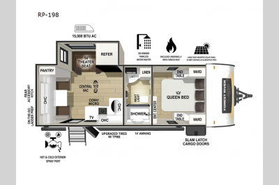Whether you spend your days at the lake or in the woods, you'll be met with comfort in this spacious travel trailer. There is a rear dinette where you can enjoy your meals together, a 56" theater seat across from a 12V TV, and a slide out for added space. The walk-through bath includes a night light for easy nighttime use, and the front master bedroom includes a queen bed just like at home. There are also dual wardrobes and end tables plus an entertainment center if you want to add a TV. Outside, you'll find a rear accessory hitch, upgraded tires with TPMS, a 14' awning, and a slam latch cargo doors to keep your gear secure.