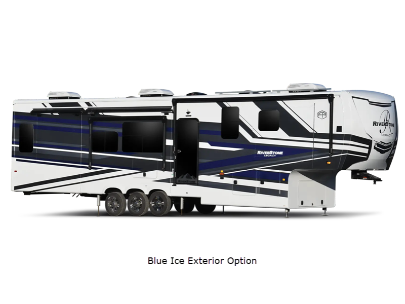The Forest River RiverStone fifth wheels and toy haulers are super luxurious and convenient for all your camping or full-time needs! These elegant units have standard features that will enhance every aspect of your trip, like a cordless vacuum, 18-cubic foot French door refrigerator with an ice maker, an under-bed storage compartment, and hydraulic slide outs.