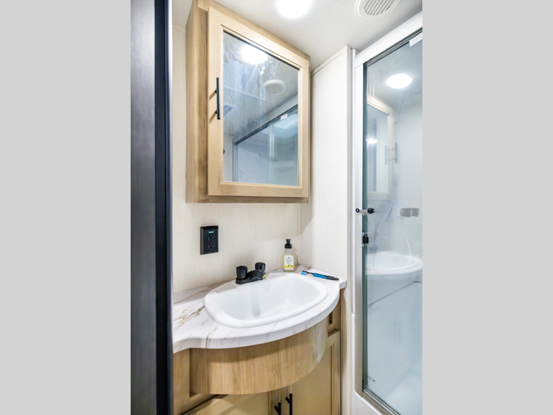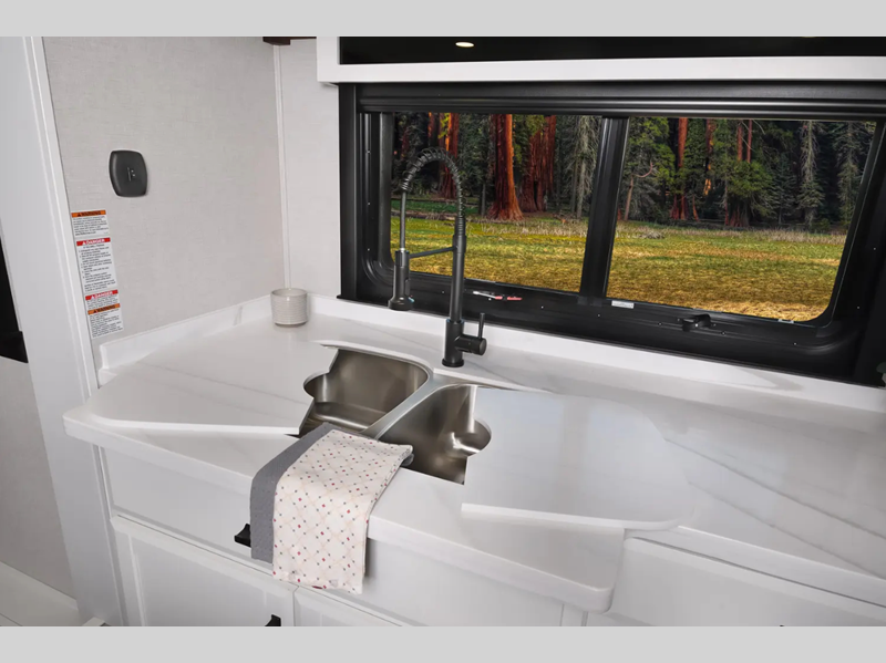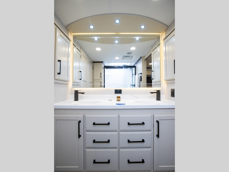 You will truly appreciate the stackable washer/dryer because it will allow you to travel without restraint, and the Truma Aqua Go Comfort on-demand hot water heater will give you hot water whenever you need it. You'll stay entertained with a Samsung LED Smart TV in the living room and a 40" LED TV in the bedroom, and the 200W solar panel will provide some off-grid capabilities.