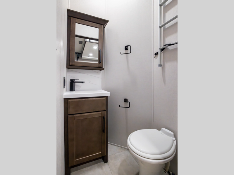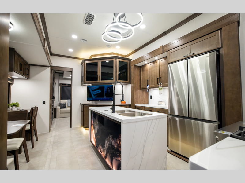 The Forest River RiverStone fifth wheels and toy haulers are super luxurious and convenient for all your camping or full-time needs! These elegant units have standard features that will enhance every aspect of your trip, like a cordless vacuum, 18-cubic foot French door refrigerator with an ice maker, an under-bed storage compartment, and hydraulic slide outs.