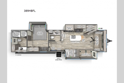 Enjoy extended stays in this triple slide out destination trailer! Once you unload your bags, you can put out the 19' awning with LED lights and relax in your camp chairs. The Chef Collection three burner range will let you make lunch for your crew when you head inside, and there is a free-standing dinette with a bench and two chairs to dine at. After your meal, you can relax on the theater seating across from the entertainment center with a hidden pantry behind it. There is also a front tri-fold hide-a-bed sofa to let guests sleep over. The mid-coach half bath will be easily accessible to use, and the full rear bath will create a master bedroom you are sure to love. There is a king bed slide out here, a dresser with TV prep, and two wardrobes to keep your things tidy! With each Sierra Destination Trailer by Forest River you will enjoy many luxurious features, such as crown molding over the kitchen cabinets, solid surface kitchen countertops, a memory foam mattress, plus so much more. The extra large picture windows throughout let natural light in and provide beautiful outdoor views, and each model includes three or more slides for added interior space. You'll find many exterior conveniences, like the porch light with an interior switch, the rain gutters with extra long drip spouts to prevent black streaking, and an electric awning with LED light strip, plus more! You will stay comfortable year around with dual 15,000 A/C units plus each model is constructed with an Underbelly Armor for better protection and insulation! We have 1 389HBFL availableView InventorySpecificationsSleeps 4 Slides 3 Length 39 ft 11 in Ext Width 8 ft 5 in Ext Height 13 ft 4 in Hitch Weight 1510 lbs GVWR 13510 lbs Dry Weight 11774 lbs Cargo Capacity 1736 lbs Fresh Water Capacity 50 gals Grey Water Capacity 104 gals Black Water Capacity 104 gals Tire Size 16" Furnace BTU 40000 btu Available Beds King Refrigerator Type Stainless Steel 12V Refrigerator Size 19.6 cu ft Cooktop Burners 3 Number of Awnings 1 LP Tank Capacity 30 lbs Water Heater Capacity 60000 gal Water Heater Type On Demand Tankless AC BTU 30000 btu TV Info LR 50" Flat Screen TV Awning Info 19' Electric with LED Light Strip Axle Count 2 Washer/Dryer Available Yes Number of LP Tanks 2 Shower Type Standard Similar Destination Trailer Floorplans