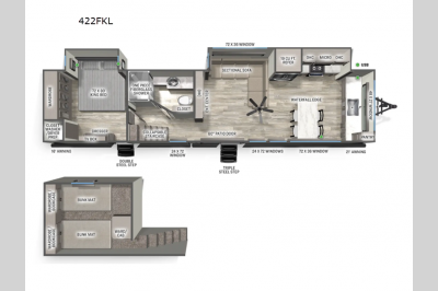 This incredible destination trailer has everything you need to live life to the fullest. Imagine retreating to a peaceful rear bedroom, complete with a king bed slide, spacious wardrobe, plus a closet with washer and dryer prep. Unwind and pamper yourself in style in the incredible full bathroom, featuring a linen closet, medicine cabinets, and a fiberglass shower with a seat. The living room is the heart of the home, boasting a comfortable sectional sofa, ottoman, and entertainment center perfect for gathering with family or friends and creating unforgettable memories. The loft is a cozy retreat for kids or guests, featuring two bunk mats, and a dual wardrobe/bookcases for their things. The front kitchen has a 19 cu. ft. refrigerator, overhead cabinet, microwave, three-burner cooktop, and free-standing dinette with a waterfall edge, and the pantry provides ample storage for all your favorite foods. Finally, step outside and enjoy the shade and protection of the two awnings and the two entry and two exit doors will make it easy to come and go. With each Sierra Destination Trailer by Forest River you will enjoy many luxurious features, such as crown molding over the kitchen cabinets, solid surface kitchen countertops, a memory foam mattress, plus so much more. The extra large picture windows throughout let natural light in and provide beautiful outdoor views, and each model includes three or more slides for added interior space. You'll find many exterior conveniences, like the porch light with an interior switch, the rain gutters with extra long drip spouts to prevent black streaking, and an electric awning with LED light strip, plus more! You will stay comfortable year around with dual 15,000 A/C units plus each model is constructed with an Underbelly Armor for better protection and insulation! We have 1 422FKL availableView InventorySpecificationsSleeps 8 Slides 2 Length 42 ft 8 in Ext Width 8 ft 5 in Ext Height 13 ft 4 in Hitch Weight 1570 lbs GVWR 14000 lbs Dry Weight 11929 lbs Cargo Capacity 2071 lbs Fresh Water Capacity 50 gals Grey Water Capacity 135 gals Black Water Capacity 54 gals Tire Size 16" Furnace BTU 40000 btu Available Beds King Refrigerator Type Stainless Steel 12V Refrigerator Size 19 cu ft Cooktop Burners 3 Number of Awnings 2 LP Tank Capacity 30 lbs Water Heater Capacity 60000 gal Water Heater Type On Demand Tankless AC BTU 30000 btu TV Info LR 50" Flat Screen TV Awning Info 16' and 21' Electric with LED Light Strip Axle Count 2 Washer/Dryer Available Yes Number of LP Tanks 2 Shower Type Standard Similar Destination Trailer Floorplans