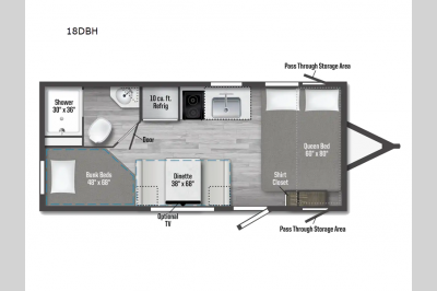 This travel trailer is designed to make camping more comfortable, affordable, and fun for the whole family! The front 60" x 80" queen bed offers a comfortable place to lay your head at night and a shirt closet to hang your clothes. There are a set of 48" x 68" bunk beds for others to sleep, and you can even transform the 38" x 68" booth dinette into extra sleeping space. The fully equipped kitchen has everything you need to prepare a delicious home cooked meal and a 12V refrigerator to store any leftovers. After a fun-filled day, head to the rear corner bathroom to freshen up in the 30" x 36" shower with a skylight to let in some natural lighting!
