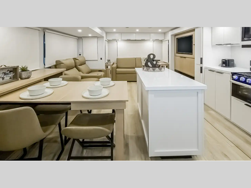 Sleeps 4 Slides 2 Length 36 ft 3 in Ext Width 8 ft Ext Height 11 ft 2 in Int Height 6 ft 8 in Interior Color Modern Luxe Hitch Weight 944 lbs GVWR 10400 lbs Dry Weight 8426 lbs Fresh Water Capacity 60 gals Grey Water Capacity 49 gals Black Water Capacity 49 gals Tire Size 225/75R15E Furnace BTU 30000 btu Available Beds Olympic Queen Refrigerator Type 12V Refrigerator Size 10.6 cu ft Cooktop Burners 3 Shower Size 30" x 40" Number of Awnings 2 Axle Weight 5200 lbs LP Tank Capacity 40 lbs Water Heater Type Tankless AC BTU 15000 btu TV Info Smart TV Awning Info 11' and 12' Powered patio awning w/LED lighting Axle Count 2 Washer/Dryer Available Yes Number of LP Tanks 1 Shower Type Standard Electrical Service 30 amp Solar Wattage 200 watts Similar Floorplans