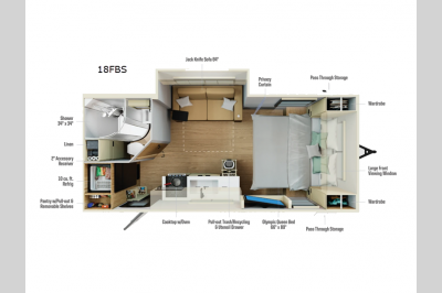 It will be so easy to enjoy camping trips in this compact travel trailer. The jack knife sofa slide provides more floor space plus a place for an overnight guest to sleep. You'll find an Olympic queen bed up front with a privacy curtain and dual bedroom wardrobes to keep your things tidy. A recessed three burner cooktop with an oven will let you make meals each day, and the 10.6 cu. ft. 12V refrigerator will keep your cold items fresh. There is also a pantry with pull-out shelves for added storage space. The full bath includes a power vent fan and a shower skylight that will give you more lighting and extra head room as you get ready each day!