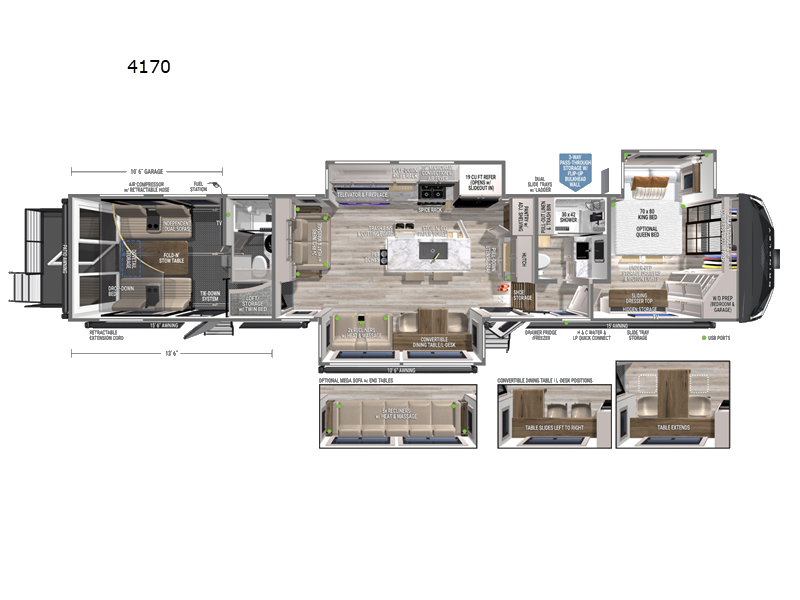 | TV Info | LR 50" Smart TV, Garage 43" Smart TV, BR 32" Smart TV | Awning Info | 10' 6", 15', 15' 6", and Rear Patio Power w/Neon Lights |